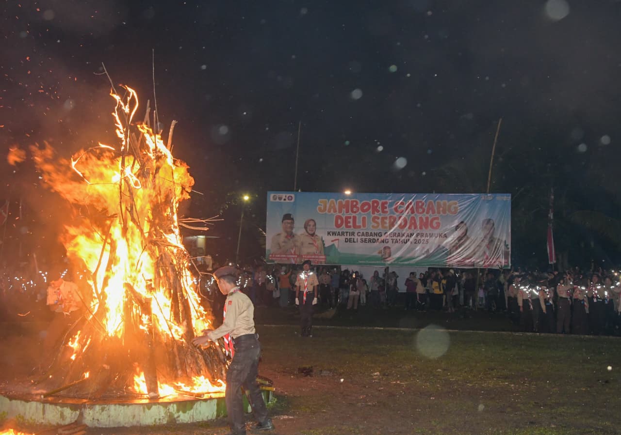 DELI SERDANG, iNewsMedan.id – Malam api unggun menjadi penutup rangkaian Jambore Kwartir Cabang (Kwarcab) Gerakan Pramuka Deli Serdang Tahun 2025 di Cadika Lubuk Pakam, Desa Tanjung Garbus I, pada Jumat malam (21/11/2025). Momen ini disimbolkan sebagai semangat persatuan, keteguhan hati, dan tekad untuk berbuat baik di tengah masyarakat.
