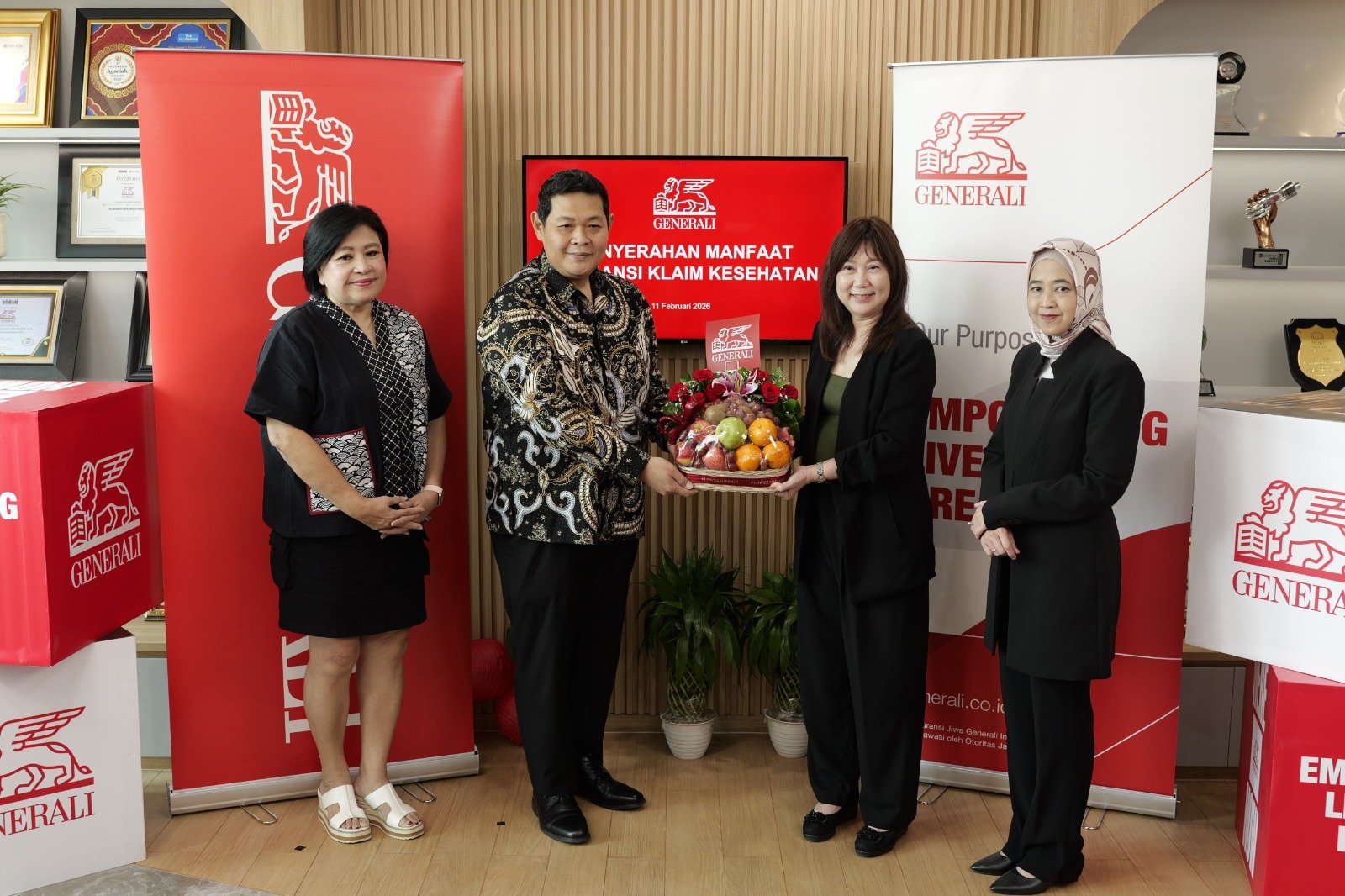 Direksi Generali Indonesia Jutany Japit selaku Director and Chief Agency Officer yang didampingi oleh Suzwamela Zawawi selaku Operations Group Head melakukan seremoni penyerahan klaim sekaligus menyerahkan bingkisan sehat kepada Bapak Bintoro yang didampingi oleh financial planner Generali Indonesia, Ibu Lilie, di Kantor Pusat Generali Indonesia, Jakarta pada Rabu (11/2/2026).